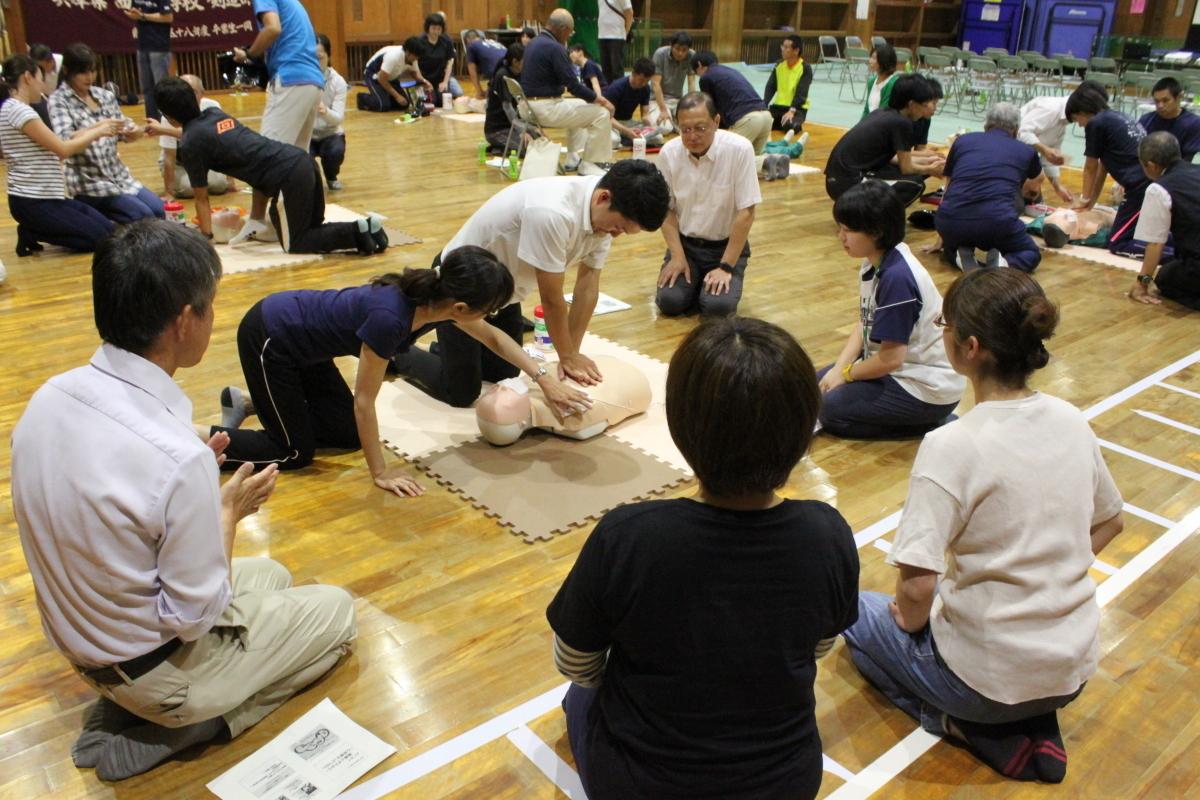 保護者と教師が、冨原医師から講習を受け、AEDも使った実習を行いました。